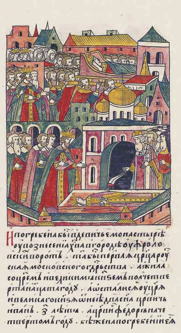 Тринадцать лет он наслаждался полным счастием семейственным, основанным на любви к супруге нежной и добродетельной. Анастасия ещё родила сына, Феодора, и дочь Евдокию; цвела юностию и здравием: но в июле 1560 года занемогла тяжкою болезнию, умноженною испугом. В сухое время, при сильном ветре, загорелся Арбат; тучи дыма с пылающими головнями неслися к Кремлю. Государь вывез больную Анастасию в село Коломенское; сам тушил огонь, подвергаясь величайшей опасности: стоял против ветра, осыпаемый искрами, и своею неустрашимостию возбудил такое рвение в знатных чиновниках, что Дворяне и Бояре кидались в пламя, ломали здания, носили воду, лазили по кровлям. Сей пожар несколько раз возобновлялся и стоил битвы: многие люди лишились жизни или остались изувеченными. Царице от страха и беспокойства сделалось хуже. Искусство медиков не имело успеха, и, к отчаянию супруга, Анастасия 7 августа, в пятом часу дня, преставилась... Никогда общая горесть не изображалась умилительнее и сильнее. Не Двор один, а вся Москва погребала свою первую, любезнейшую Царицу. Когда несли тело в Девичий Вознесенский монастырь, народ не давал пути ни духовенству, ни вельможам, теснясь на улицах ко гробу. Все плакали, и всех неутешнее бедные, нищие, называя Анастасию именем матери. Им хотели раздавать обыкновенную в таких случаях милостыню: они не принимали, чуждаясь всякой отрады в сей день печали. Иоанн шёл за гробом: братья, князья Юрий, Владимир Андреевич и юный царь Казанский, Александр, вели его под руки. Он стенал и рвался: один митрополит, сам обливаясь слезами, дерзал напоминать ему о твёрдости христианина... Но ещё не знали, что Анастасия унесла с собою в могилу!