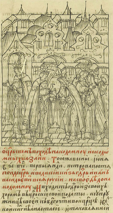 Относительно выбора невесты Иоанн повторил тот же способ, который был употреблён при первой женитьбе его отца Василия III и который существовал ещё у византийских императоров. По городам разосланы грамоты к боярам и детям боярским с приказом представить своих детей или родственниц — девиц на смотр наместникам; последние из них выбирали лучших и отсылали в Москву, а здесь между ними уже сам царь выбирал себе невесту. Из толпы собранных красавиц Иван Васильевич выбрал Анастасию Романовну Захарьину-Юрьеву[2].