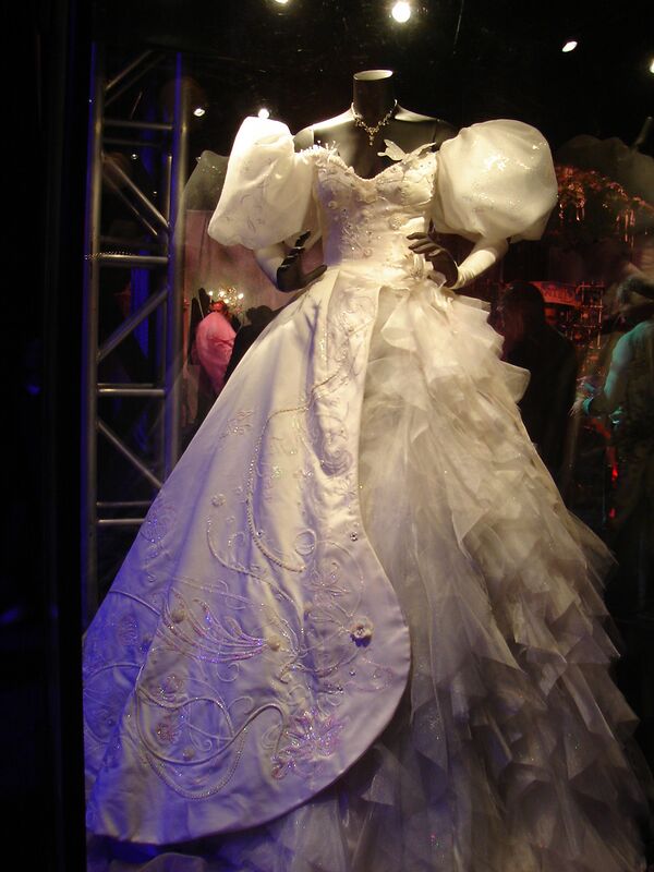 Постепенное превращение Жизель в реальную девушку находит отражение в её платьях, которые по ходу фильма становятся менее сказочными. Так роскошный свадебный наряд, который она носит в начале фильма, является полной противоположностью её современного платья в конце фильма[29]. Вид реальной Жизели в подвенечном платье так же должен был подчеркнуть «значительный контраст с плоскими рисунками» и акцентировать её внешнее сходство с диснеевской принцессой[30]. Чтобы талия выглядела очень узкой, были сделаны «невероятно пышные» рукава и огромный кринолин с металлическим обручем, который удерживал 20 слоёв юбок и оборок[31]. В общей сложности для съёмок было изготовлено 11 версий подвенечного платья, каждое из которых состояло из 183 погонных метров шёлка и других тканей и весило приблизительно 18 кг[29][31]. Свои ощущения во время носки такого платья актриса Эми Адамс назвала «изнурительными», так как «вся нагрузка приходилась на бёдра, и иногда складывалось впечатление, что её что-то держит»[32].