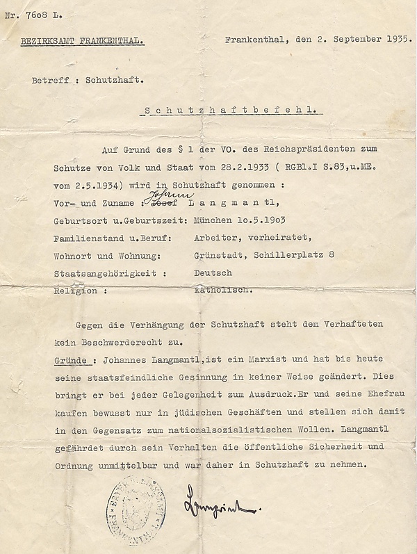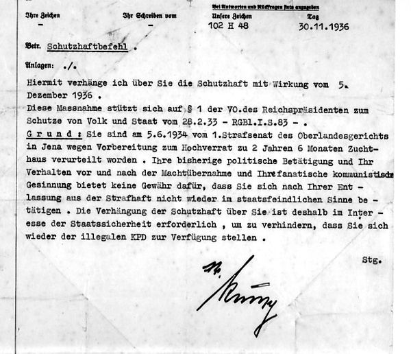С приходом к власти нацистов, вследствие указа рейхспрезидента «О защите народа и государства» от 28 февраля 1933 года были отменены несколько положений Веймарской конституции, гарантировавшие свободу собраний, свободу мнения и прессы, неприкосновенность жилища, право на частную собственность и запрет ограничений на свободу личности. В апреле 1934 года вышел специальный указ рейхсминистра внутренних дел Германии Вильгельма Фрика, регламентирующий применение мер «защитного ареста». В частности, данная практика была переведена под контроль гестапо. Арестованные помещались в особые закрытые поселения — концентрационные лагеря. При этом для ареста не требовалось никакого решения суда, а поэтому арестованным не предоставлялось права на защиту. Иногда заключённым даже не сообщалось, по какой причине они подвергались аресту.