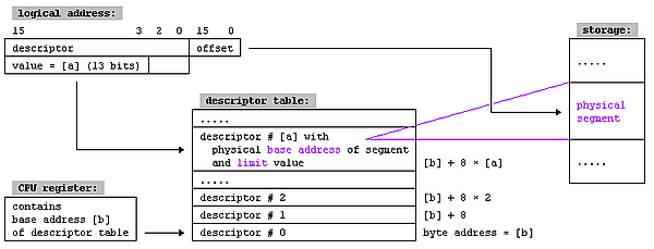 Физический адрес формируется следующим образом. В сегментных регистрах хранится селектор, содержащий индекс дескриптора в таблице дескрипторов (13 бит), 1 бит, определяющий к какой таблице дескрипторов будет производиться обращение (к локальной или к глобальной) и 2 бита запрашиваемого уровня привилегий. Далее происходит обращение к соответствующей таблице дескрипторов и соответствующему дескриптору, который содержит начальный 24-битный адрес сегмента, размер сегмента и права доступа, после чего вычисляется необходимый физический адрес путём сложения адреса сегмента со смещением из 16-разрядного регистра.