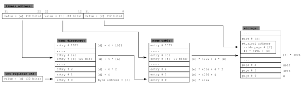 В жёлтых полях (Page table address, Page address) записаны старшие 20 бит адреса таблицы страниц и страницы соответственно (младшие 12 бит физического адреса всегда равны нулю — не забывайте о выравнивании).
