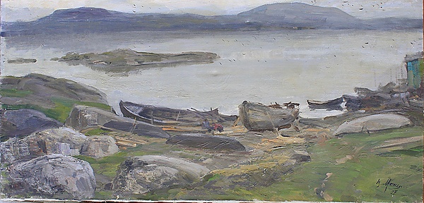 Картина выполнена в жанре пейзажа и отличается чётко выраженной многоплановой композицией. На переднем плане изображены кромка берега, крупные валуны и несколько рыбацких лодок. Во втором плане раскрывается гладь залива, а за ним расположен небольшой остров. Вдали виднеются сопки, что придаёт изображению глубину и пространственную перспективу.