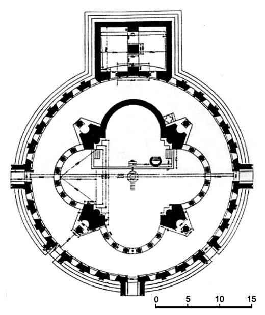 Храм, по реконструкции Т. Тораманяна, представлял собой круглое трехъярусное купольное сооружение (диаметр нижнего яруса 35,75 м). В круг основания вписан крест, три крыла которого образованы по полукругу 6 колоннами, а восточное крыло — апсида — было глухой стеной, которую покрывали мозаики и фрески. У алтарной апсиды — высокое возвышение, с одной стороны — амвон, впереди — крестильная купель. Сзади к апсиде примыкало квадратное помещение, видимо, ризница, из которой поднимались по лестнице в коридор, шедший по верху первого яруса.