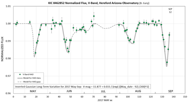 24 апреля 2017 года началось очередное падение яркости KIC 8462852 (первое с 2013 года). Наблюдение звезды велось десятками телескопов. После этого звезда стала возвращаться к своей обычной яркости. 19 и 20 мая 2017 года снижение яркости составляло 3 %[24].