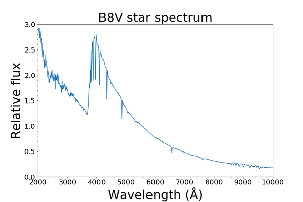 Как и у класса O, у звёзд класса B в спектрах наличествуют линии ионизованных элементов, например, O II, Si II и Mg II[комм. 1]. Однако в спектрах звёзд класса B практически нет линий He II — лишь в самых ранних подклассах[комм. 2], не позднее B0.5, могут наблюдаться слабые линии. Линии нейтрального гелия, наоборот, очень сильны и достигают наибольшей интенсивности. Также хорошо заметны линии водорода, в частности, серия Бальмера[3][4][5]. Часто у звёзд класса B также наблюдаются эмиссионные линии[6].