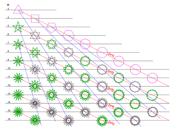 | Количество вершин правильного многоугольника | Количество звёздчатых форм правильного многоугольника | Количество нераспадающихся (связных) звёздных многоугольников среди звёздчатых форм | Количество вершин правильного многоугольника, расположенных между двумя вершинами звёздного многоугольника |