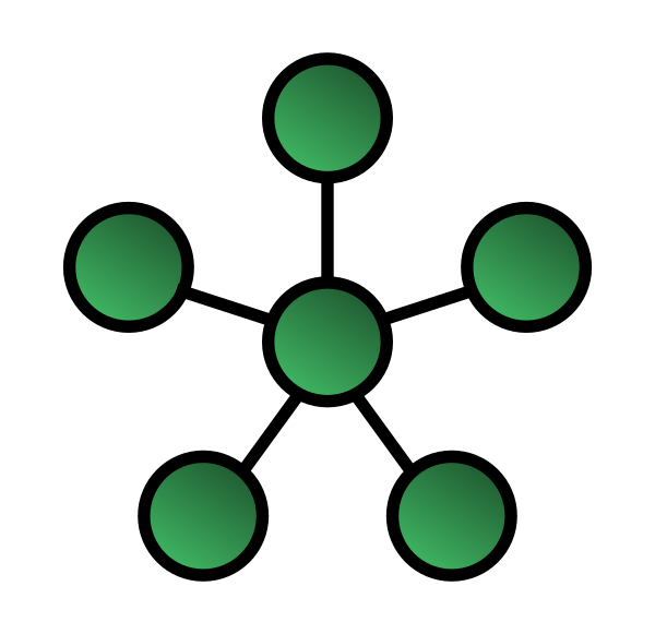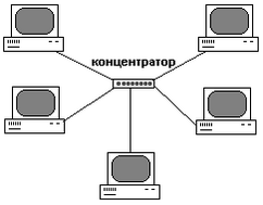В центре сети с данной топологией содержится концентратор, или коммутатор все пользователи в сети равноправны.