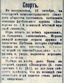 Футбол начинает постоянно и крепко входить в жизнь елисаветградской молодёжи. 16 (29) октября 1911 года на елисаветградском ипподроме состоялся матч между командой футбольного кружка завода Эльворти и первой командой мужской гимназии. Победили рабочие завода со счётом 4:1. Эта дата считается датой основания футбольного клуба «Звезда»[1]