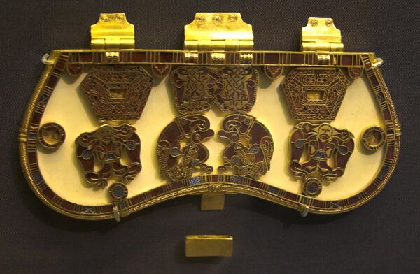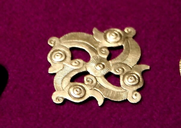 К приёмам орнаментализации изображений следует отнести особенно часто встречающееся в золотых накладках на щиты и конскую сбрую обыгрывание отверстий, пустот в изображении, усиливающих его компактность и, следовательно, восприятие издали, с расстояния, когда такая накладка выделяется и сверкает на тёмном либо ярко цветном фоне. Подобные отверстия или углубления (глаза, ноздри) мастера заполняли цветной эмалью, ценившейся в то далёкое время наравне с драгоценными камнями. Этот эффектный приём входит в общее понятие «полихромного стиля»[18].