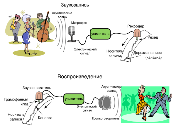 Записываемые звуковые колебания преобразуются микрофоном в соответствующие электрические токи, воздействующие после их усиления на электромеханический преобразователь — рекордер, который превращает переменные электрические токи посредством магнитного поля в соответствующие механические колебания резца[2]. Для воспроизведения применялся пьезоэлектрический, а позднее более качественный — магнитный звукосниматель. Звукосниматели преобразуют колебания иглы, бегущей по звуковой дорожке грампластинки, в электрический сигнал, который после усиления в электронном усилителе поступает в громкоговоритель.