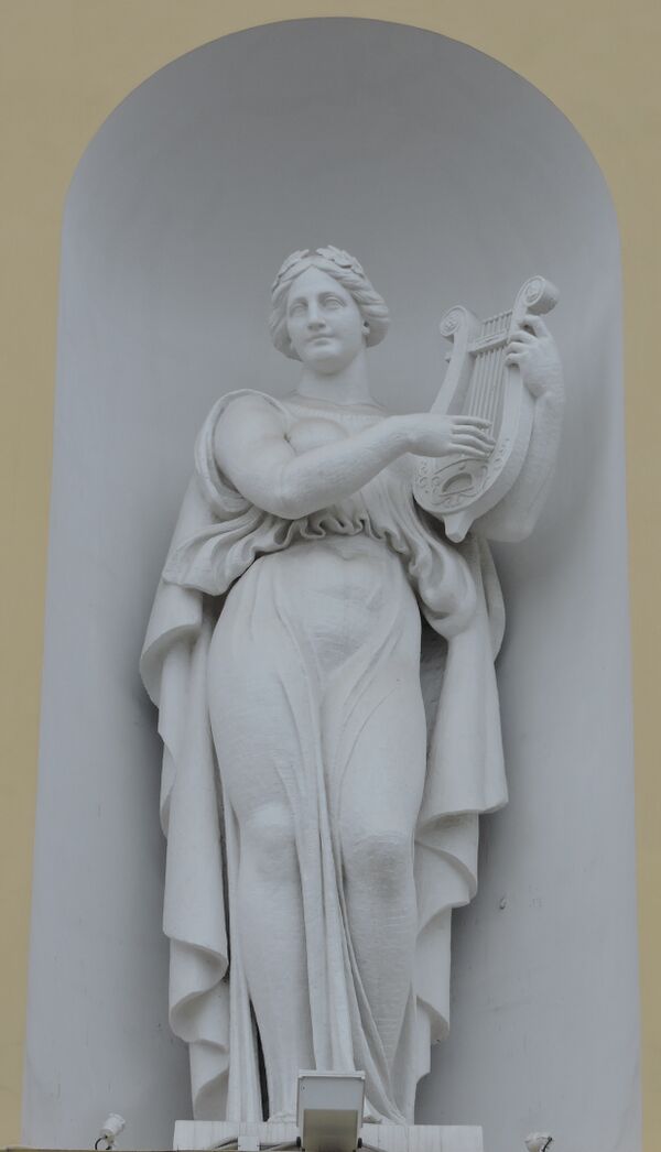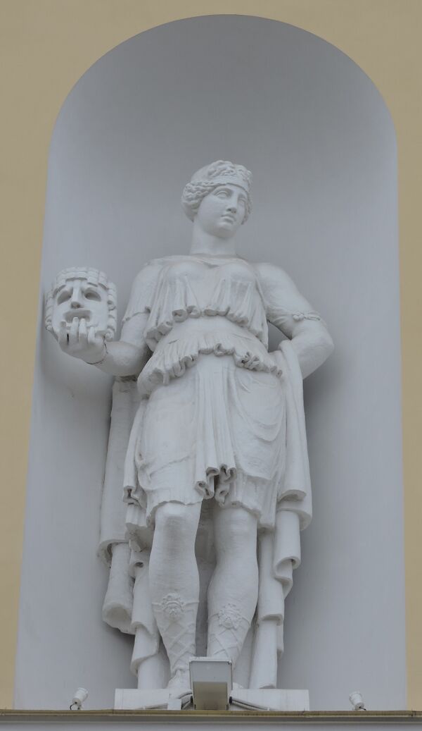 Здание окаймляет выразительный скульптурный фриз с античными театральными масками и гирляндами лавровых ветвей. В нишах на торцевых фасадах — статуи муз, на аттике главного фасада — квадрига Аполлона. Работы вёл один из выдающихся скульпторов своего времени — В. И. Демут-Малиновский.