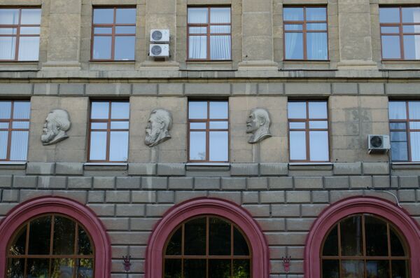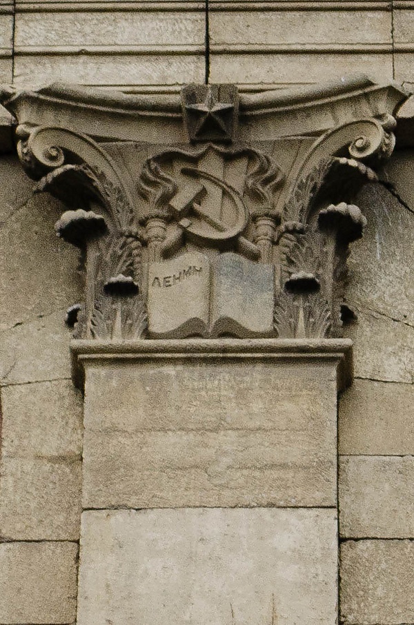 Над главным входом помещены барельефы, изображающие Маркса, Энгельса и Ленина. Ранее также присутствовал и Сталин. В навершиях пилястр имеются лепные раскрытые книги, на левой странице которых было написано — «Ленин», на правой странице — «Сталин». После развенчания культа личности Сталина его имя на книгах было замазано.