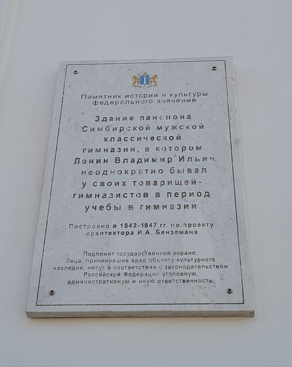 Постановлением Совета Министров РСФСР от 04.12.1974 № 624 "О дополнении и частичном изменении Постановления Совета Министров РСФСР от 30 августа 1960 г. № 1327 «О дальнейшем улучшении дела охраны памятников культуры в РСФСР», «Здание пансиона Симбирской мужской классической гимназии, в котором В. И. Ленин неоднократно бывал у своих товарищей-гимназистов в период учёбы в гимназии», получил статус объекта культурного наследия города Ульяновска федерального значения[1].