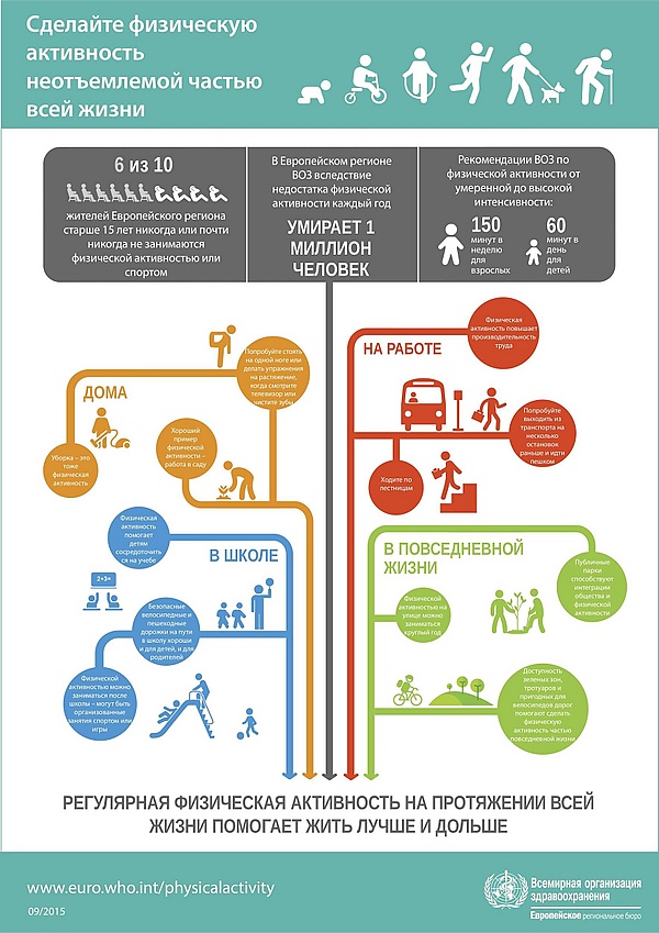 Исследования показывают, что физическая активность снижает риски смертности от всех естественных причин, а именно 2,5 часа в неделю (эквивалентно 30 минутам умеренной активности в день в течение 5 дней в неделю) по сравнению с нулевой активностью связано со снижением риска смертности от всех причин на 19 %, в то время как 7 часов умеренной активности в неделю — на 24 %[66].
