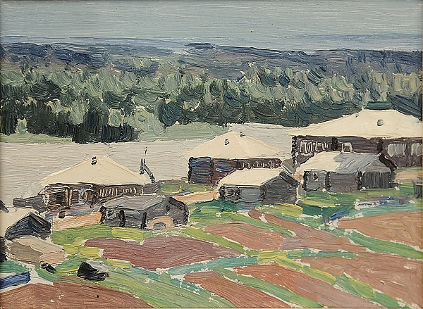 Полотно представляет собой пейзаж, на котором изображён берег реки с тремя деревянными домами под двускатными белыми крышами, выстроенными в ряд. Перед домами также в ряд расположены три деревянные постройки, а перед ними — грядки земли, разделённые бороздками, поросшими зелёной травой. На противоположном берегу реки виднеется полоса густого леса, а на линии горизонта проходит голубая полоса леса.