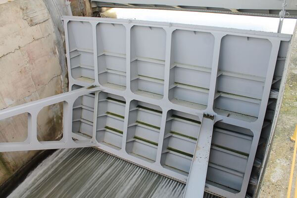 - водоприёмник с двумя водопропускными отверстиями размером по 5×5 м, оборудованный сороудерживающими решётками и плоскими аварийно-ремонтными затворами;