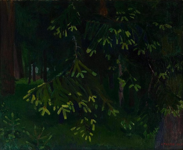 В композиции работы по краям изображены толстые коричневые стволы старых деревьев, обрезанные верхним краем полотна. На переднем плане выделяются сочная зелень травы с молодыми ёлочками, а также развесистые ветви старых елей с молодой светло-зелёной хвоей, напоминающей птичьи лапки. В глубине по центру картины просматривается густая чаща старого леса с едва различимыми коричневыми стволами деревьев.