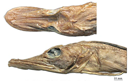 Грануляция (туберкуляция) на лобных костях и колючках первого спинного плавника отсутствует или очень слабая, представлена гладкими костными гранулами; на верхнечелюстной кости и передней половине зубной кости, а также на лучах жаберной мембраны грануляция отсутствует полностью. В переднем участке медиальной боковой линии округлые прободённые костные бляшки (костные чешуи) как правило отсутствуют, а если встречаются, то в виде едва заметных очень тонких, гибких, полупрозрачных пластинок. В нижней части первой жаберной дуги тычинки формируют только внешний ряд; на внутренней стороне дуги тычинки обычно отсутствуют или изредка в углу дуги встречается 1—2 тычинки (отмечены лишь у 2-х рыб из 29 исследованных).