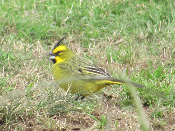 Длина тела составляет 20 см[6] Клюв чёрный, основание нижней челюсти серое. Лапы чёрные. Радужка коричневая. Самец очень яркий: у него чёрный хохолок и горло, спина оливковая с чёрными полосами. Брови, малярные области, бока шеи и нижняя часть тела жёлтые. Крылья тёмно-коричневые с оливковыми каймами на внешних опахалах. Края крыльев и внутренние кроющие перья жёлтые. Хвост: центральные перья чёрные, остальные жёлтые с коричневой внешней каймой. Самка менее яркая снизу, хохолок коричневый. Брови жёлтые, ушные перья, грудь и бока серые. Спина серая с тёмно-коричневыми полосами. Горло тёмно-коричневое с беловатой окантовкой. Брюхо жёлтое. Крылья коричневые с охристыми и жёлтыми каймами. Края и внутренние кроющие перья жёлтые. Хвост такой же, как у самца.[3]