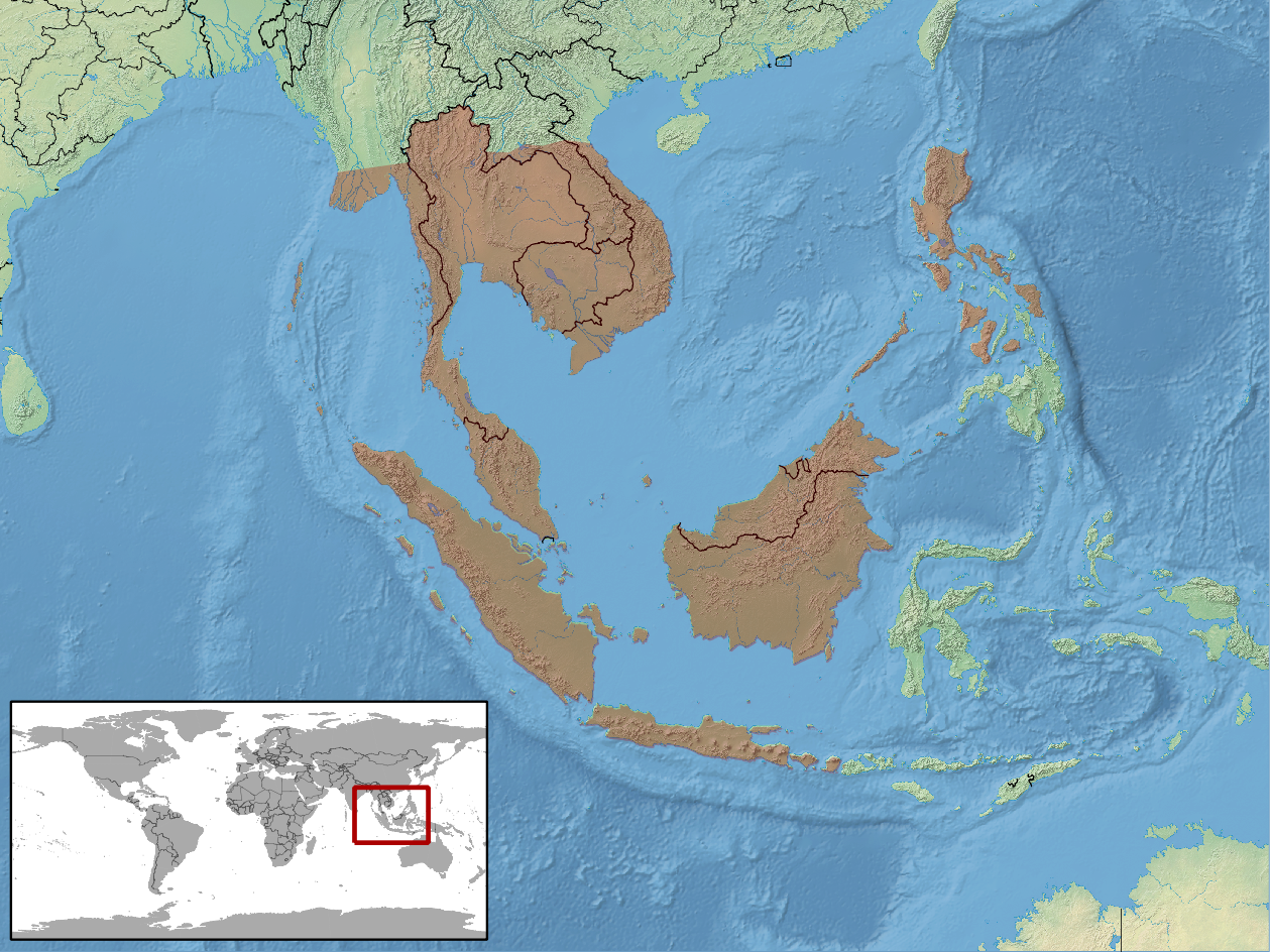 Обитает в тропических лесах Юго-Восточной Азии: на полуострове Индокитай (от Бирмы до Вьетнама), полуострове Малакка, Малайском архипелаге, включая Филиппины, Никобарских и Андаманских островах[3]. Населяет первичные леса, вторичные насаждения, плантации и сады. Встречается до высоты 1100 м над уровнем моря. Обитает обычно вблизи рек, мангровых болот и других водоёмов.