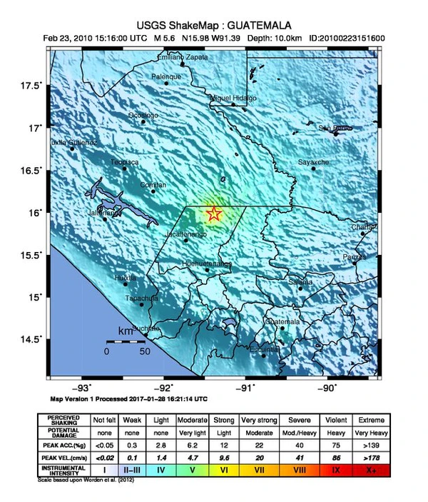 Землетрясение магнитудой 5,6 произошло 23 февраля 2010 года в 15:16:00 (UTC) в Гватемале, в 11 км к северо-северо-востоку от Барильяс. Гипоцентр землетрясения находился на глубине 10,0 километров[3].