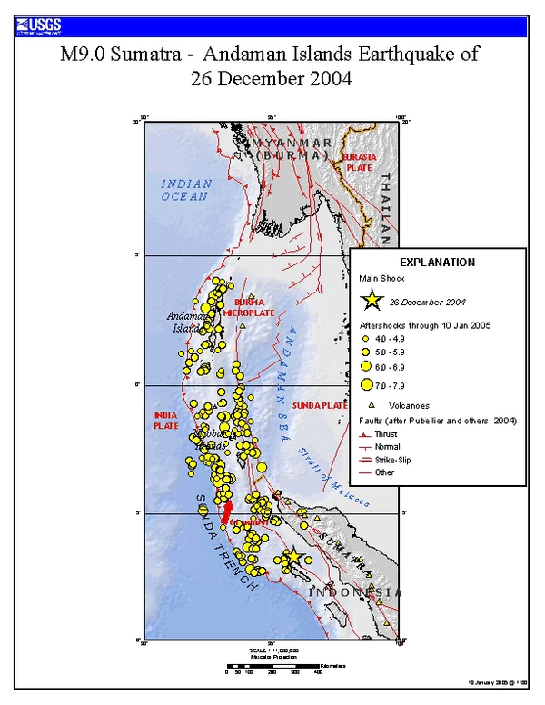 Индийская плита — часть большой Индо-Австралийской плиты, которая выстилает Индийский океан и Бенгальский залив, двигаясь на северо-восток со средней скоростью 6 см в год. Индийская плита соприкасается с Бирманской плитой, которая считается частью большой Евразийской плиты, образуя Зондский жёлоб. В этом месте Индийская плита пододвигается под Бирманскую плиту, на которой находятся Никобарские острова, Андаманские острова и северная часть острова Суматры. Индийская плита постепенно сползает всё глубже и глубже под Бирманскую плиту, пока возрастающая температура и повышающееся давление не превращают пододвинутый край Индийской плиты в магму, которая в итоге выбрасывается наверх через вулканы (так называемая Вулканическая дуга). Этот процесс прерывается из-за сцепления плит на несколько столетий, пока нагнетающееся давление не станет в результате причиной крупного землетрясения и цунами.