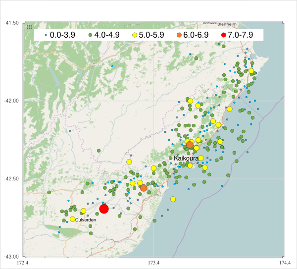 | 14 ноября 2016 | 19:43:00 | 5.6 | 23 км (14 миль) | 30 км к юго-западу от Каикоуры | [131] |