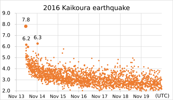 | 14 ноября 2016 | 13:34:22 | 6.3 | 35 км (22 миль) | 30 км к юго-западу от Каикоуры | [127] |