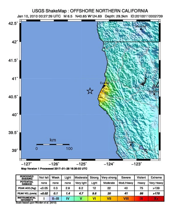 Землетрясение в Юрике в 2010 году магнитудой 6,5 произошло 9 января 2010 года в 16:27:38 по тихоокеанскому времени в прибрежной зоне округа Гумбольдт, штат Калифорния, США. Эпицентр землетрясения был расположен вдали от берега Тихого океана в 53 км к западу от ближайшего крупного города, Юрика[4][5][6][7]. Кроме того, 4 февраля 2010 года произошло другое землетрясение в прибрежной зоне Юрики с несколько меньшей магнитудой — 5,9[8]. Это землетрясение также вторым значительным землетрясением в районе Юрика[9]. Землетрясение 9 января 2010 года ощущалось на территории от южного округа Санта-Круз до Юджина, штат Орегон на севере. На востоке сейсмические колебания ощущались в Рино, штат Невада[6].