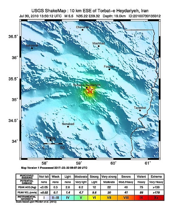 Землетрясение магнитудой 5,5 произошло 30 июля 2010 года в 13:50:12 (UTC) на северо-востоке Ирана, в 10,6 км к востоку-юго-востоку от Торбете-Хейдерие (остан Хорасан-Резави)[3][4][5][6]. Гипоцентр землетрясения располагался на глубине 19,0 километров. Интенсивность землетрясения составила VII по шкале Меркалли[1]. Землетрясение ощущалось в Ашхабаде (Туркменистан)[7].
