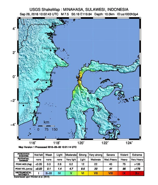 Землетрясение магнитудой 7,5 произошло на острове Сулавеси; эпицентр землетрясения был расположен у основания полуострова Минахаса примерно в 78 км от города Палу, административного центра провинции Центральный Сулавеси, на глубине 10 км. Толчки ощущались практически на всём острове, а также в индонезийской провинции Восточный Калимантан и в восточномалайзийском штате Сабах.