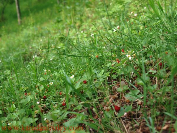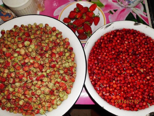 Земляника лесная (Fragaria vesca), слева направо: вид плодоносящих растений; плоды дикорастущих растений;