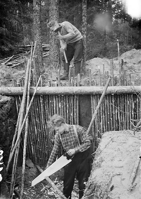 Второй этап работы — установка опорных столбов и укладка стропил или, если конструкция иная, то устанавливают перекрытия. Столбы по возможности желательно вкопать в котловане, на глубину 30-50 см. Если в месте постройки грунт слабый, то под торец вкопанной стойки укладывают подкладку (кирпич, кусок доски, бревна и т. п.). При дефиците длинных стоек крайние из них можно вывести за пределы котлована, что позволит в некоторых случаях обойтись одним длинным продольным бревном (прогоном). Расстояние между стойками принимают равным около 1,5 м — всё зависит от толщины и веса прогона и укладываемого на крышу материала. Сверху на стойки кладут и закрепляют бревно (прогон), толщиной 15-16 см — он служит опорой для стропил землянки. Для того, чтобы он держался, стойку делают двойной из жердей неодинаковой длины и толщины, сбитой гвоздями (по возможности с полоской жести), деревянным чопиком, или связанных между собой проволокой. В качестве ограничителя можно использовать прибитый к стойке небольшой кусочек доски. Толстую несущую часть стойки желательно сделать из жерди, диаметром не менее 13-14 см, тонкую — из жерди, диаметром 8-10 см. Верхние концы тонких частей всех четырёх стоек отпиливают на высоте около 2 м 20 см под один уровень. На полученные уступы (образованные выступающими частями) укладывают сверху прогон и прикрепляют его (вбитым металлическим или деревянным штырём, скобами, а за неимением их и просто привязывают его верёвкой или проволокой), для того, чтобы связать стойки между собой. Стойки ставятся в таком порядке, чтобы несущая часть стойки помещалась то с одной, то с другой стороны тонкой стойки, и таким образом, получала дополнительное укрепление.