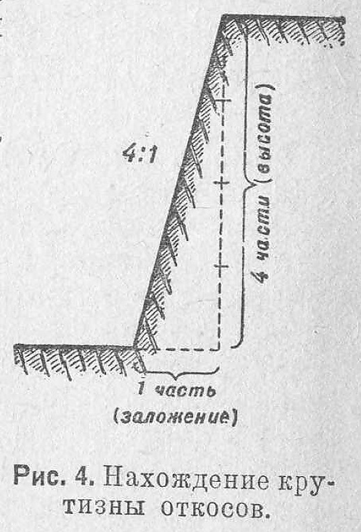Откосами называют боковые наклонные насыпи — стенки грунта в котлованах или траншеях. Крутизна откосов — это отношение высоты откоса насыпи к его основанию, её делают такой, чтобы насыпь была устойчивой и не сползала.