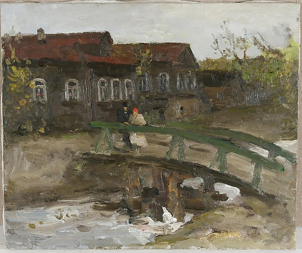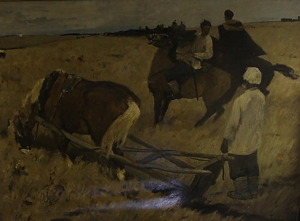 На первом плане композиции изображён седой крестьянин, стоящий спиной к зрителю у лошади, запряжённой в плуг. Его одежда — длинная белая рубашка и лапти — подчёркивает принадлежность к традиционному укладу русской деревни.