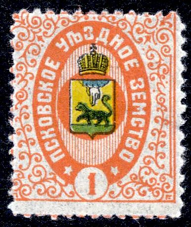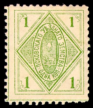 Выпуск собственных земских почтовых марок начался в 1871 году. На марках был изображён герб Псковской губернии.