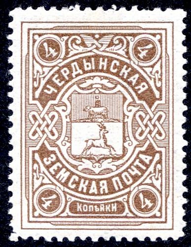 Первые почтовые марки земской почты Чердынского уезда появились в почтовом обращении 1 января 1889 года. Марки номиналом 1, 2, 3, 4 и 10 копеек продавались:[6]