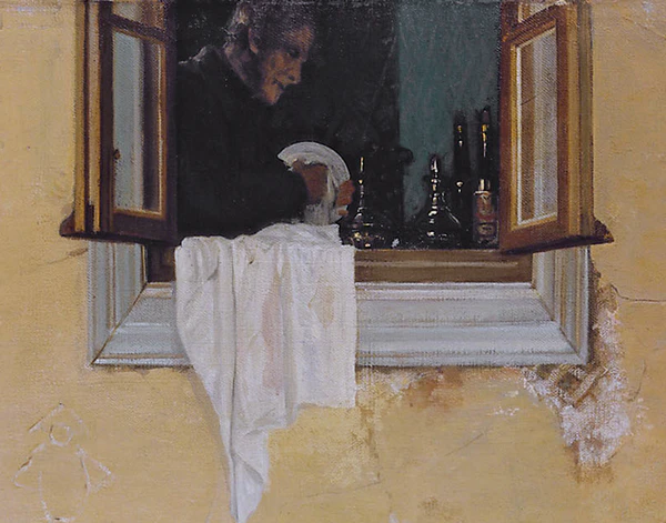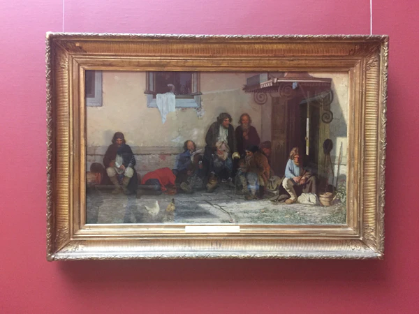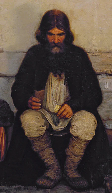 Другой мужчина, также сидящий на крыльце, грустно задумался, посыпая хлеб солью. Её ему предлагает стоящий возле него крестьянин, в дружелюбном жесте и открытом выражении лица которого проявляется искреннее желание помочь своему товарищу[48]. Характерно внимание художника к деталям — таким, как заскорузлые руки, бережно посыпающие хлеб солью, а также две тряпицы, в которые завёрнута сама соль[51]. Рядом с этими двумя крестьянами — опирающийся на палку старик, взгляд которого полон горечи[48]. Он является одним из самых ярких образов полотна: в его сгорбленной от многолетнего труда фигуре и изборожденном морщинами лице «можно прочитать простую и горькую историю его жизни»[38]. В центре картины, под открытым окном, изображён добродушный крестьянин «с живым, лукавым взглядом», который держит в руке пучок молодого зелёного лука. Он насторожился, прислушиваясь к тому, что происходит в комнате над ним,[48] — возможно, к звону перетираемой посуды[51]. Левее него лежит крестьянин в яркой кумачовой рубахе. Его одежда выглядит новее, чем у других крестьян, — возможно, он самый молодой из них[17]. Он спит, положив голову на котомку, его лица почти не видно[48]. Образ крестьянина, сидящего у стены в самой левой части картины, своими позой, взглядом и наклоном головы, а также «какой-то особой самоуглублённостью» созвучен светловолосому крестьянину в голубой рубахе, сидящему на крыльце в правой части полотна. По словам Ирины Шуваловой, «их схожие, симметрично расположенные по краям фигуры уравновешивают и замыкают центральную группу, придавая композиции устойчивость и завершённость»[48]. Искусствовед Михаил Алпатов также отмечал, что «двое по краям намеренно посажены строго фронтально, симметрично — в этом попытка придать сцене монументальность»[52].
