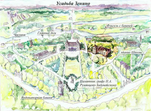 После приобретения усадьбы Николай Андриянович вместе с женой Зенаидой Сергеевной сразу же приступил к работе по реконструкции и отделке усадебного комплекса. С этого периода обширная усадьба стала называться «Зенино»[7][1]. Вся территория вокруг барского дома и других построек была разбита на несколько участков[8].