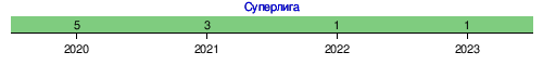 | 2020 | Суперлига | — | 5 из 8 | 14 | 4 | 3 | 7 | 14 | 14 | 0 | 15 | ¼ финала | не проводился | — | [8][9][10] | |