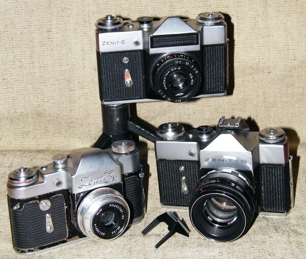- «Зенит» (1952, первый фотоаппарат под этой маркой) — удачный опыт создания зеркального фотоаппарата на базе дальномерного («Зоркий»);