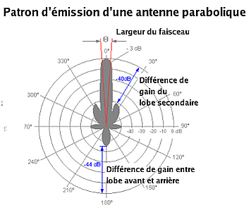 Угловая ширина луча антенны и её диаграмма направленности не зависит от того, работает ли антенна на приём или на передачу. Ширина луча определяется по уровню половинной мощности луча, то есть по уровню (-3 дБ) от его максимального значения. Для параболических антенн этот уровень определяется по формуле: