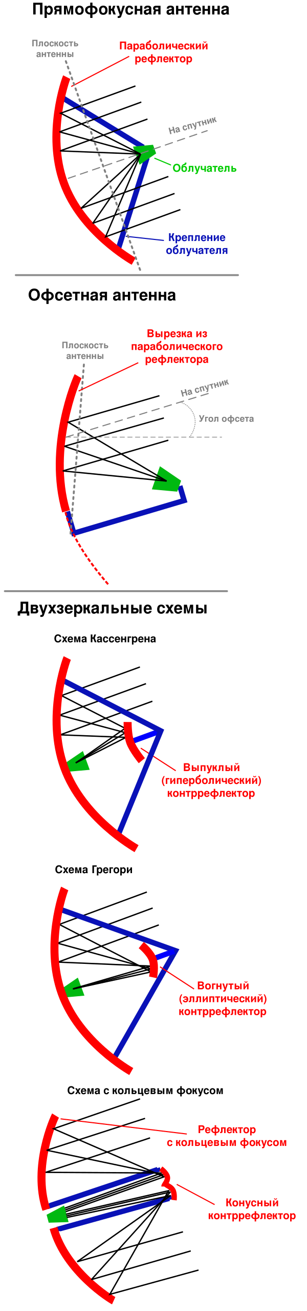 Фокус облучателя антенны может располагаться как в фокусе зеркала F, так и быть смещённым относительно него. Если фокус облучателя расположен в фокусе антенны, то она называется прямофокусной. Прямофокусные антенны существуют различных размеров, в то время как осенесимметричные антенны, облучатель которых находится не в фокусе зеркала, обычно не превышают в диаметре более 1,5 м[3]. Такие антенны часто называют офсетными. Преимущество офсетной антенны — это бо́льший коэффициент усиления антенны, что обусловлено отсутствием затенения раскрыва зеркала облучателем[3]. Рефлектор офсетных антенн представляет собой боковую вырезку из параболоида вращения. Фокус облучателей в таких антеннах расположен в фокальной плоскости рефлектора.