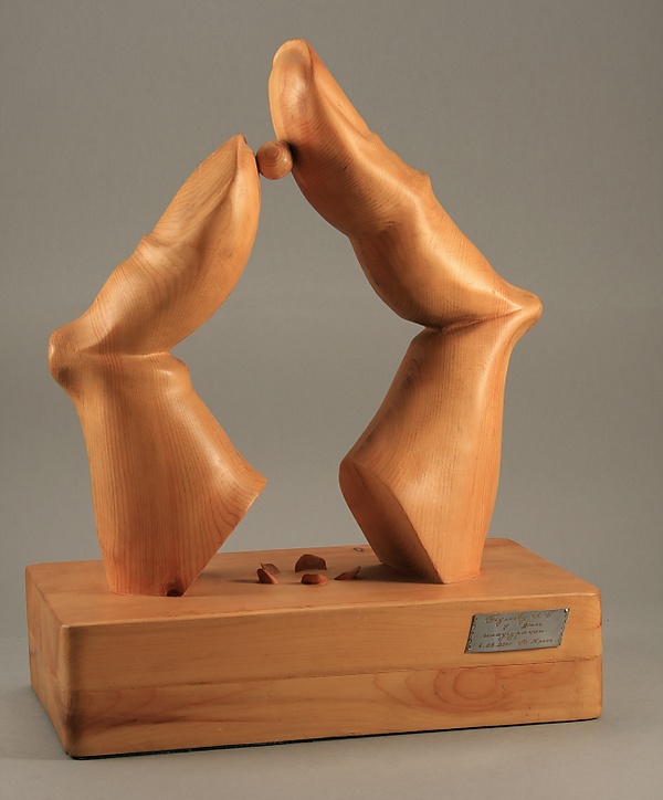 Работа выполнена из светлого дерева с применением техники резьбы. Гравировка используется для создания надписей и декоративных элементов. Металлическая пластина, закреплённая на основании, вводит элемент контраста и служит для передачи дарственной надписи. Сочетание дерева и металла подчёркивает художественную концепцию скульптуры.