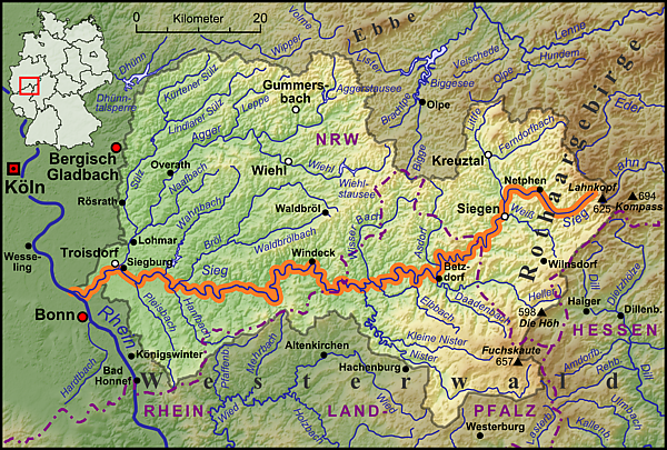 Минуя города Хеннеф и Зигбург, река впадает в Рейн около города Нидеркассель, всего в нескольких км к северу от Бонна.