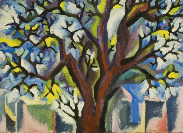 В центре холста представлен сложный силуэт фиолетово-красного дерева, композиционный центр которого занимает декоративный узор ветвей, выполненный чередованием голубого, белого, жёлтого, синего и чёрного цветов. На втором плане в нижней части холста изображены условные по манере исполнения розовато-синие постройки.