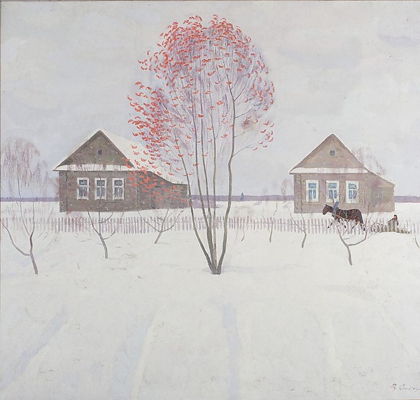В центре композиции на переднем плане изображена пятиствольная рябина с яркими гроздьями ягод. Слева и справа за забором расположены два деревянных дома. Справа за забором находится лошадь, запряжённая в сани, в которых сидит крестьянин. Сцена иллюстрирует типичный мотив бытового жанра, отражая повседневную жизнь сельской местности.