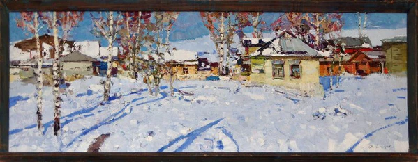 Зимний пейзаж на первом плане показывает залитый солнцем бело-голубой снег, по которому слева возвышаются две берёзы с жёлто-розовой листвой. От их стволов расходятся короткие синие диагональные тени. Немного позади располагается группа берёз и кустарник с серо-зелёными ветвями. Во втором плане до линии горизонта тянется ряд одноэтажных деревенских построек с заснеженными крышами. В центре композиции справа смещён вперёд жёлтоватый дом с двумя окнами и серой крышей, припорошенной снегом; правее стоит оранжевое здание, над которым возвышается стена красного дома с аналогичной крышей. На заднем плане виднеются заснеженные холмы. Небо написано ярко-голубым цветом, застланным серо-ядовитыми облаками.