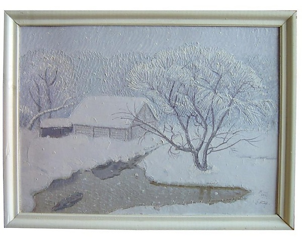 На картине представлен деревенский пейзаж в пасмурный зимний день с падающим снегом. На переднем плане изображена часть незамёрзшего водоёма, справа на его берегу — раскидистое заснеженное дерево. В левой части полотна расположен заснежённый деревянный дом с пристройкой. На заднем плане, слева от дома, виден покосившийся ствол дерева без кроны, а также группа высоких деревьев, покрытых снегом. Вся поверхность земли полностью укрыта снежным покровом. Работа выполнена в бело-голубо-сиреневых оттенках, что определяет её цветовую гамму.